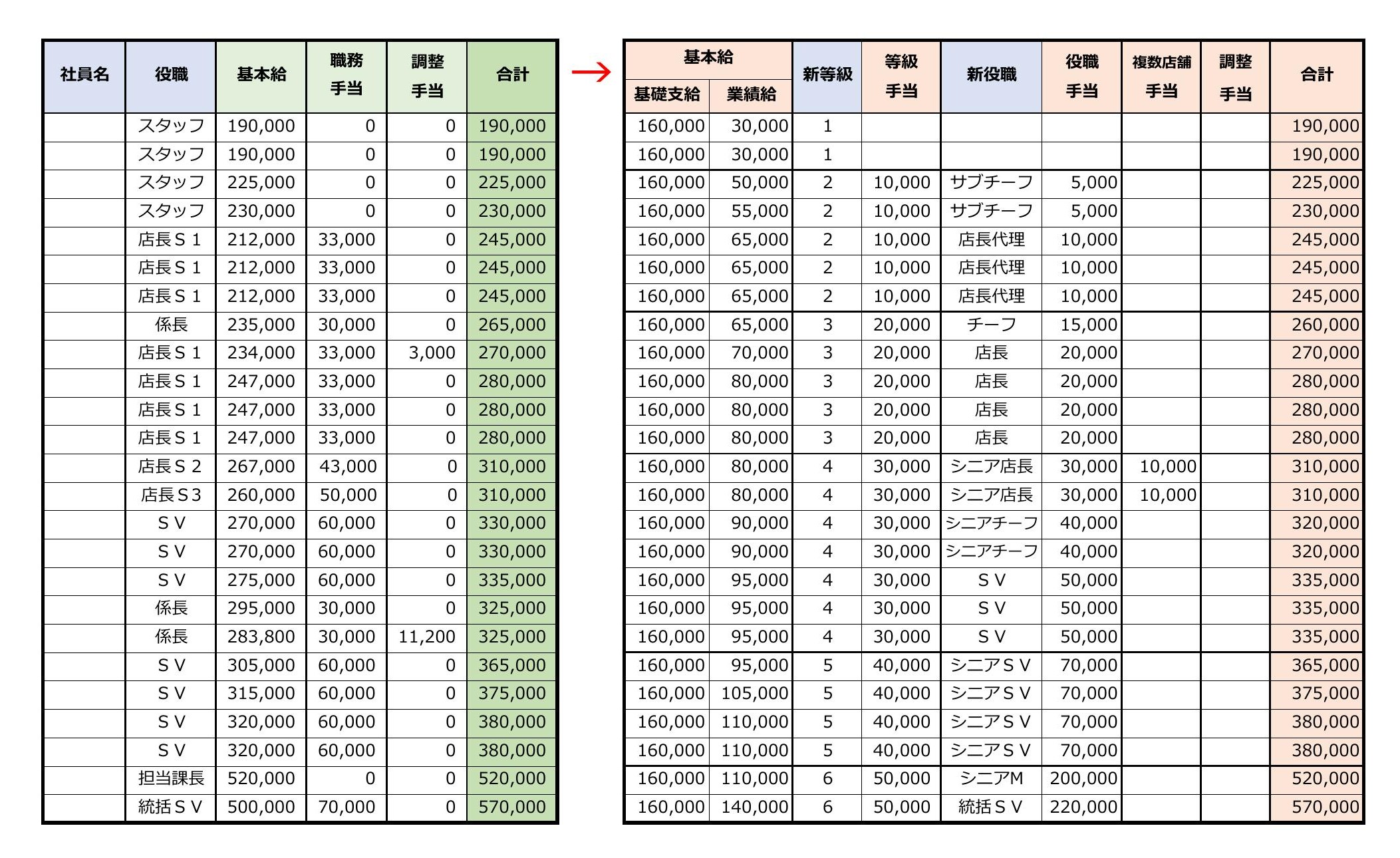 【表】給与項目ビフォー・アフターのイメージ